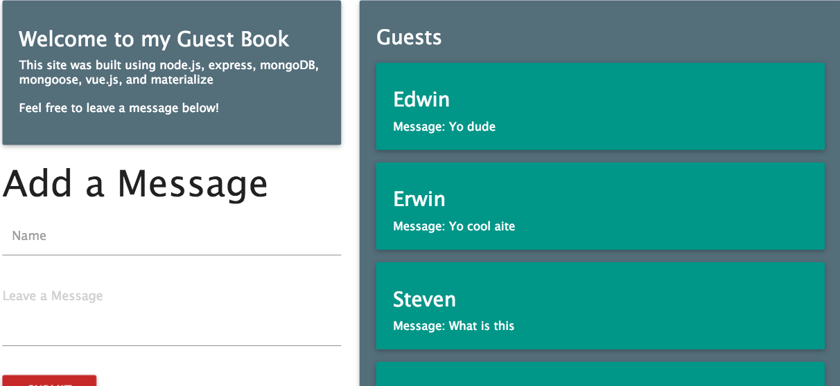 Built this simple guest book application using node and express to set up server. For the database I used mongoDB along with mongoose for data modeling. Finally I used vue.js as the javascript framework, using ajax to perform server requests. Server is hosted by Heroku.